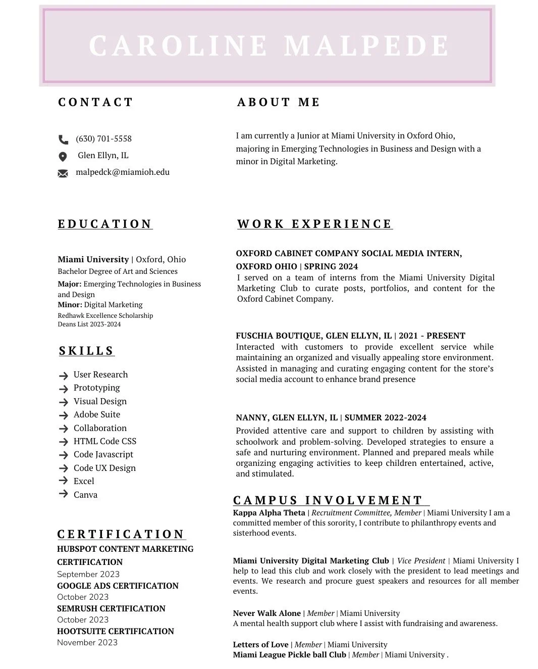 My name is Caroline Malpede and I attend Miami University, in Oxford Ohio. I am majoring in Emerging Technologies in Business and Design with a minor in Digital Marketing.