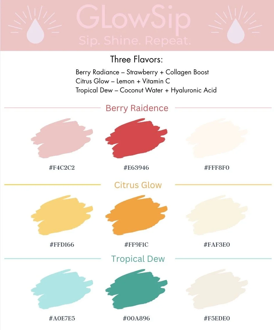 Font Choice: I selected Montserrat and Futura for their clean, modern, and elegant feel, which aligns with GlowSip’s premium yet approachable identity. It gives the brand a friendly touch while maintaining sophistication.